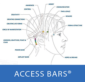 Access Bars® refers to the 32 bars of energy that run through and around your head. These bars are linked to different facets of your life. The bars store the electromagnetic components of all your thoughts, decisions, ideas and beliefs throughout your life.